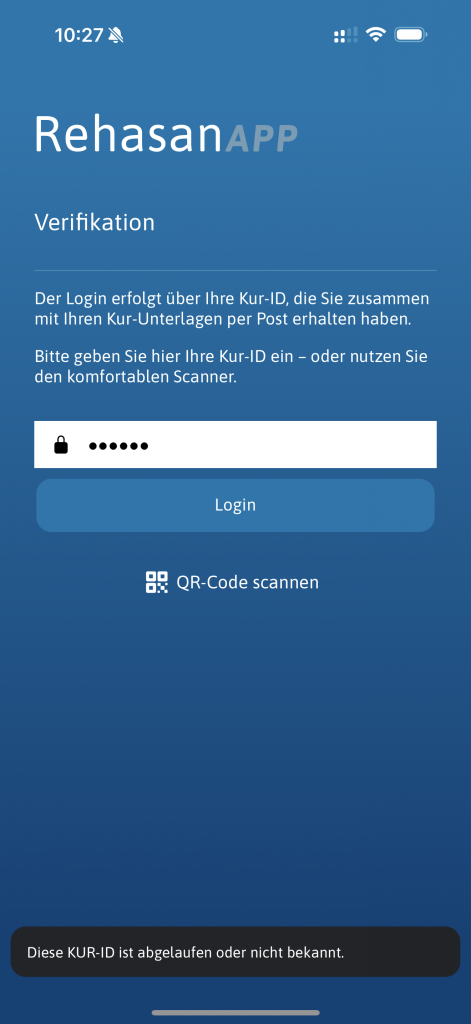 Entweder ist der Code abgelaufen, oder der QR-Code ist defekt. Probieren Sie den 32-stelligen Code über das Eingabefeld einzugeben. Wenn das nicht funktioniert, melden Sie sich bitte bei der Klinik.