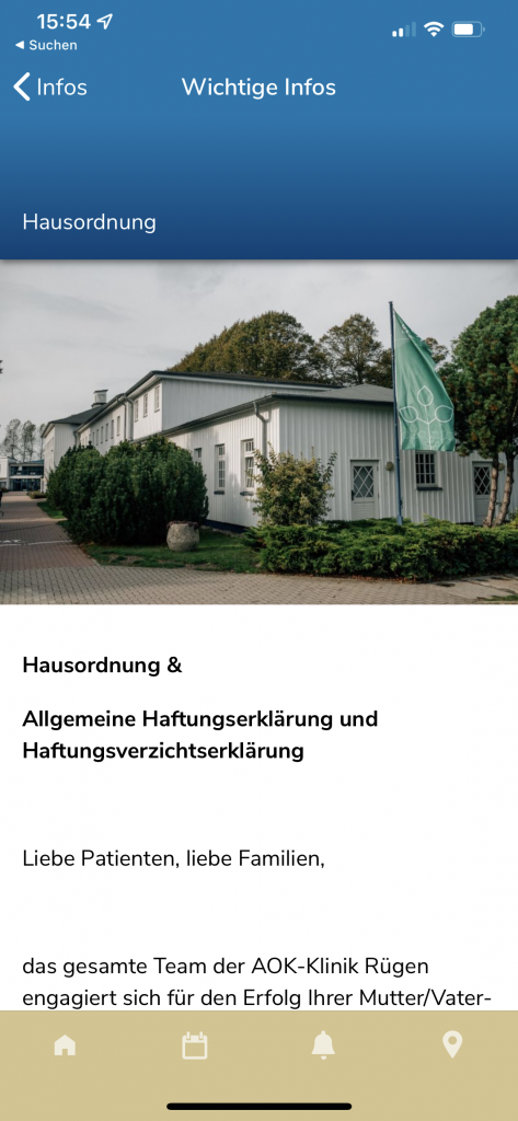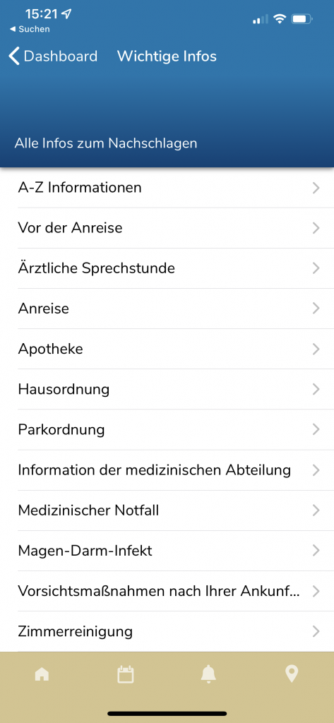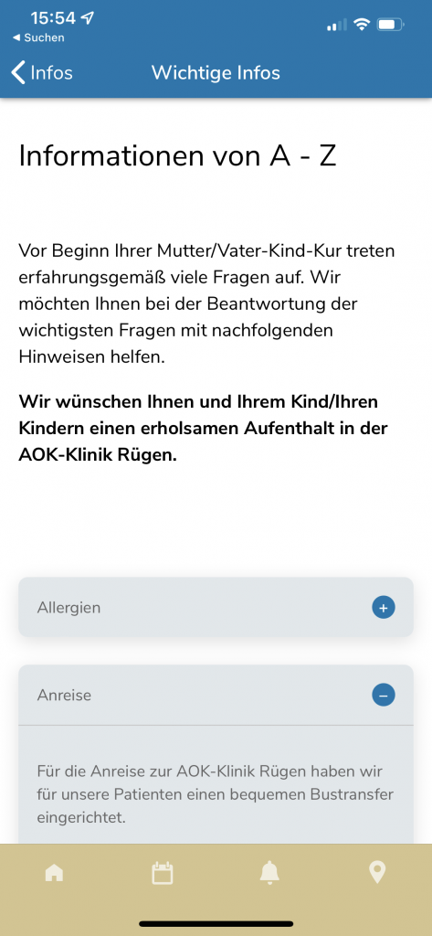 Die App liefert Ihnen alle Informationen, die Sie für Ihren Kuraufenthalt benötigen. Im Bereich wichtige Information haben wir alles für Sie zusammen gestellt. Damit Sie auch nichts verpassen, benachrichtigen wir Sie in dringenden Fällen auch per Pushnachricht. Zu Ihren Anwendungen gibt es einen persönlichen Kalender in der App mit Ihren Therapieterminen.