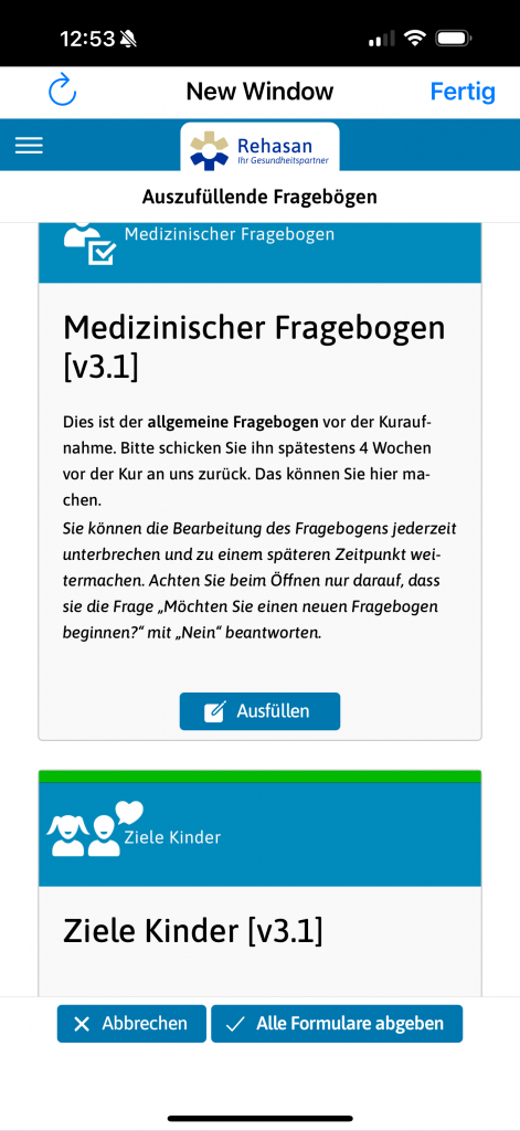 Wenn Sie die Fragebögen abgegeben haben, landen diese automatisch bei der Klinik. Achten Sie darauf, dass Sie alle Fragen beantwortet haben. Wenn etwas fehlt, werden Sie per Push-Nachricht von uns benachrichtigt.