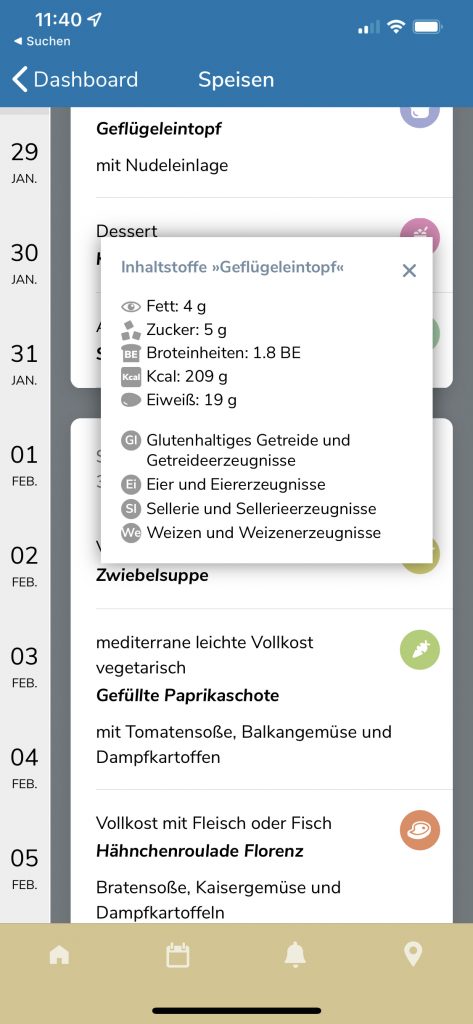- Klick auf Menü zeigt die Liste der Zusatzstoffe sowie den Zucker oder Fettgehalt