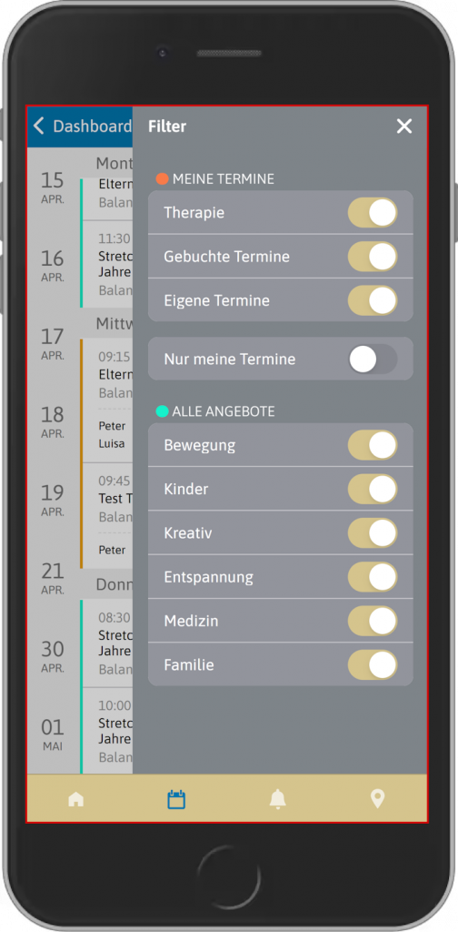 Die Freizeittermine können in der App gebucht werden. Auch die Termine der Kinder oder Begleitpersonen. Ebenso können die Termine storniert werden. Wenn es eine Warteliste gibt, rückt der nächste Patient automatisch nach.