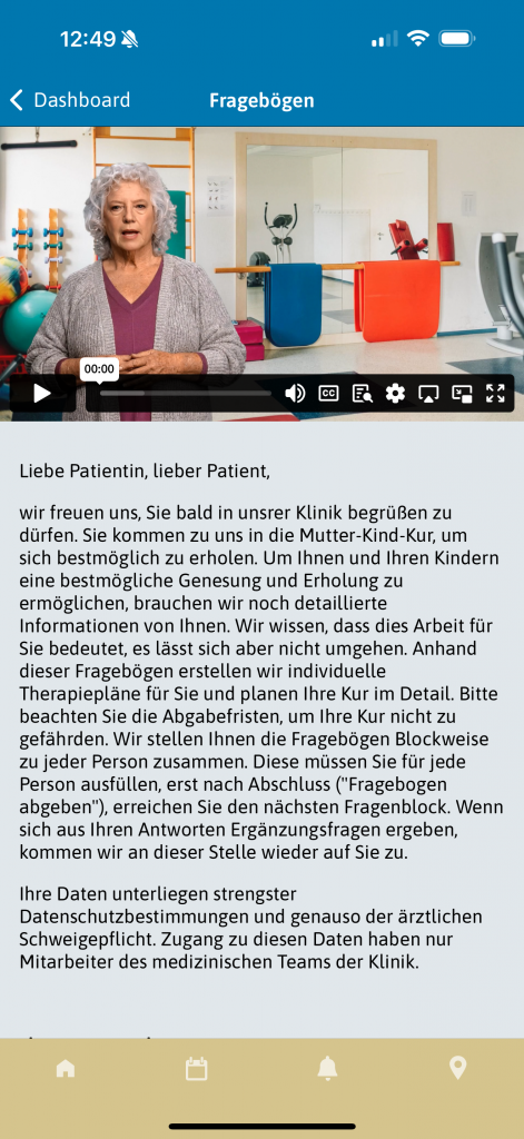 - Ansprache an den Patienten, auch als Videoerklärung. Hier wird der Patient für das sorgfältige Ausfüllen der Fragebögen sensibilisiert und über den Datenschutz aufgeklärt.