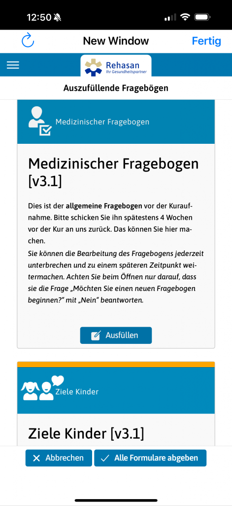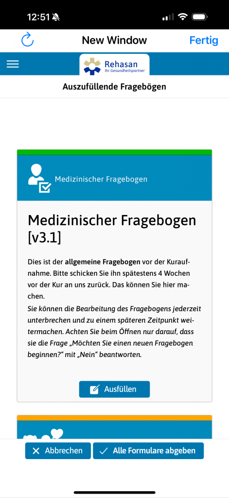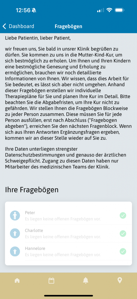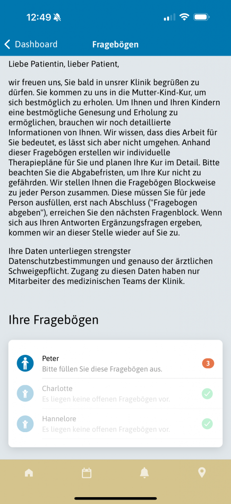 Der Vorkurstatus ist für die Organisation und Planung der individuellen Patienten-Kur gedacht. Hier werden die Vorabfragebögen und etwaige Informationen organisiert. Die Klinik kann auch über Pushmitteilung individuell und spezifisch mit dem Patienten kommunizieren.
