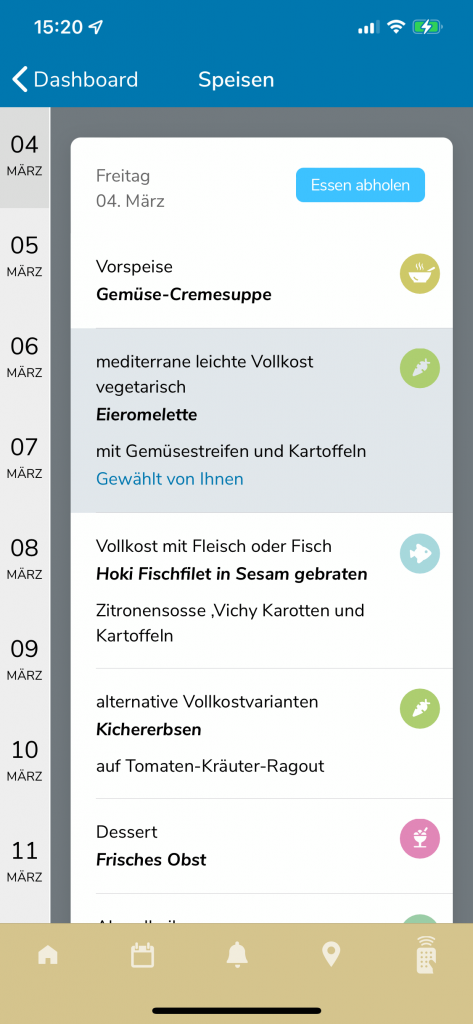 - Wenn eine andere Seite geöffnet ist (z. B. „Speisen“), erscheint der direkte Smart-Button in der Footerleiste rechts.