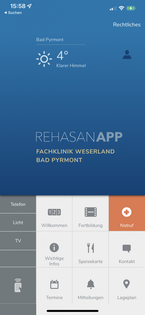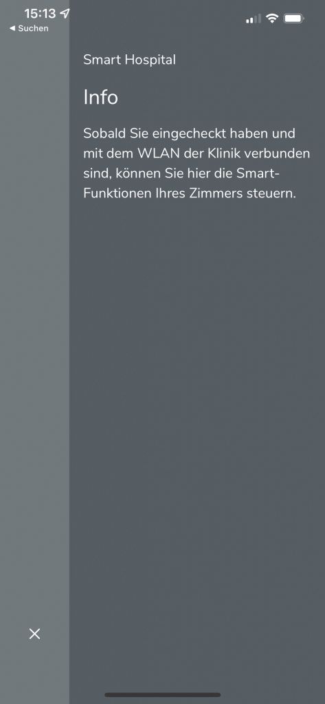 Smart-Funktionen sind Hardwaresteuerungen, die für bestimmte Kliniken als Zusatzfunktionen zur Verfügung stehen. Im ersten Schritt wird die Weserlandklinik in Bad Pyrmont für die Funktionen freigeschaltet. Die Funktionen sind dann aktiv, wenn der Patient mit seiner Patienten-ID in der App eingeloggt ist und zusätzlich über das KVS (Klinikverwaltungssystem) auf ein Zimmer oder Appartment eingecheckt ist. Ist der Patient nicht eingecheckt, erscheint in der App der entsprechende Hinweis (s. u.).