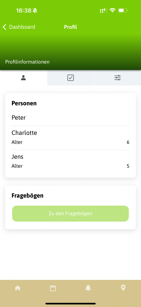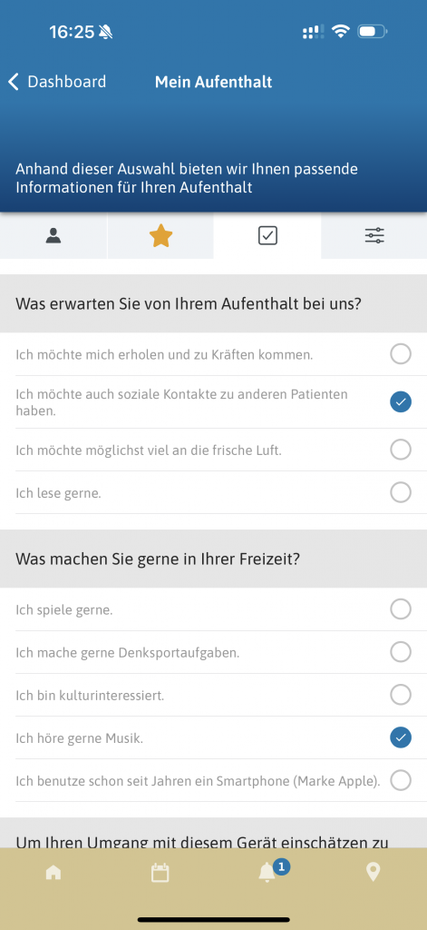 - In „Mein Aufenthalt“ sind Ihre Profildaten (Eingangsfragen) gespeichert. Diese sind wichtig, um Ihnen wichtige Informationen passend zu Ihrem Profil zukommen zu lassen.
